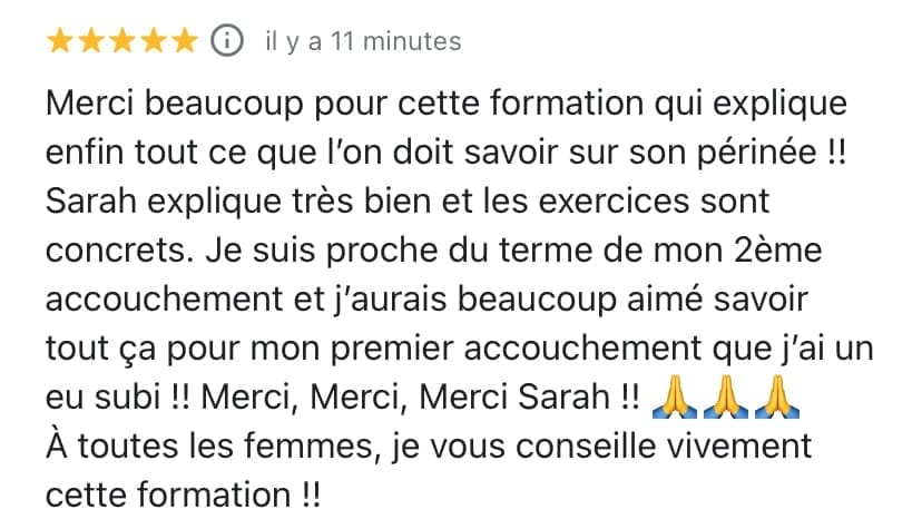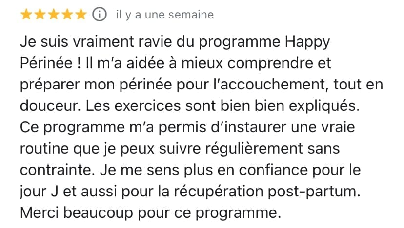 Plusieurs de mes clientes ont commencé Happy Périnée à 37-38 semaines de grossesse et m'ont dit : "J'aurais aimé le découvrir avant, mais au moins j'ai eu les infos essentielles pour l'accouchement !"